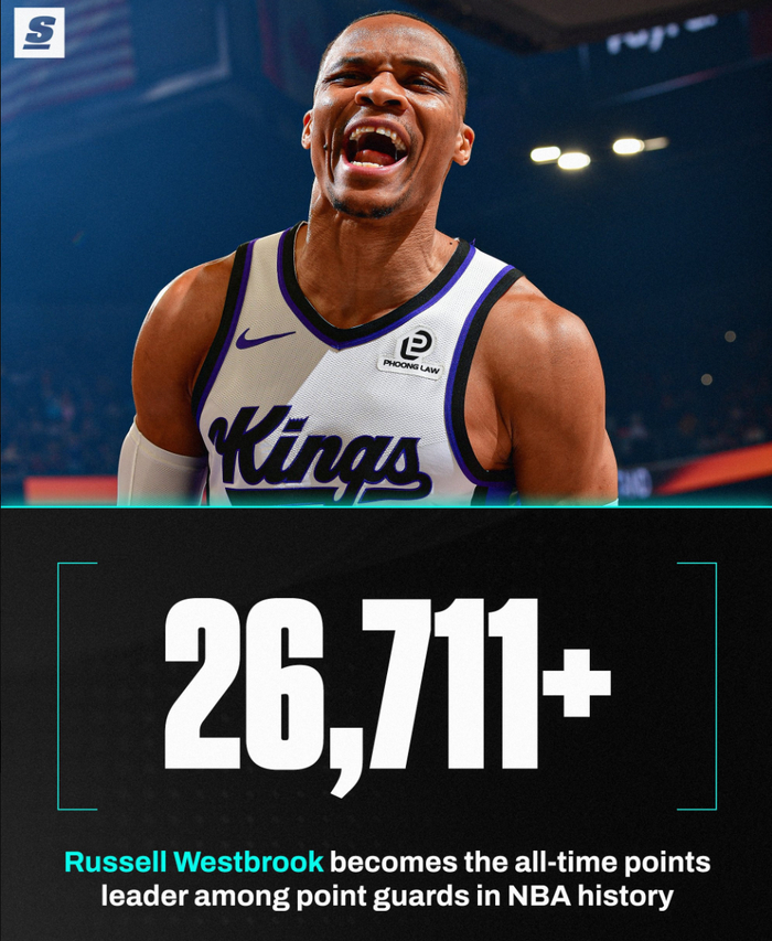 北京时间1月3日,国王102-129惨败太阳,这是一场毫无悬念的比赛,太阳一直牢牢掌控局势,末节更是一波32-19将国王按在地板上摩擦。37岁的威少这场比赛却迎来了里程碑的夜晚,他的历史总得分超过26711+超过大O,成为历史控卫得分王 nba。。