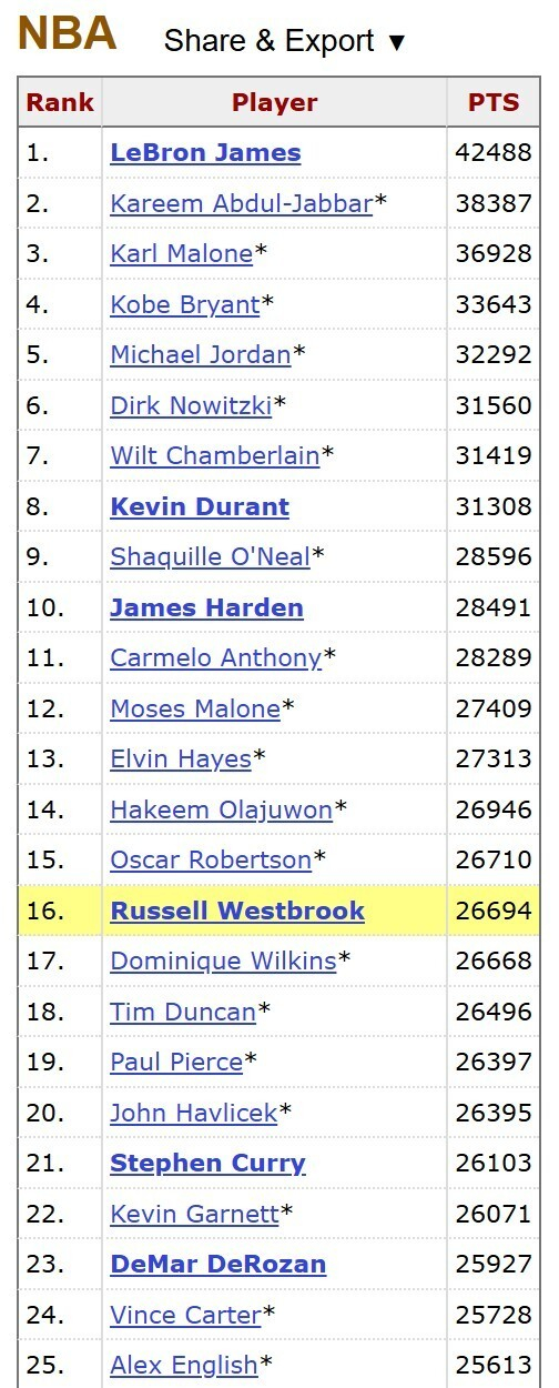 本场比赛,威斯布鲁克代表国王首发出战,他12投6中得到了17分9篮板6助攻1抢断,三分球3中1,罚球5中4,出现了4次失误和3次犯规,正负值为-11。在本场比赛之前,威少总得分为26694分,距离前一位的“大O”奥斯卡-罗伯特森相差16分。此役过后,威少完成了对罗伯特森的超越,升至历史总得分榜第15位,他也成为NBA历史上得分最多的后卫球员 哈基姆·奥拉朱旺。。目前排在第14位的是“大梦”奥拉朱旺,威少距离前者还有235分的差距,本赛季完成超越指日可待。
