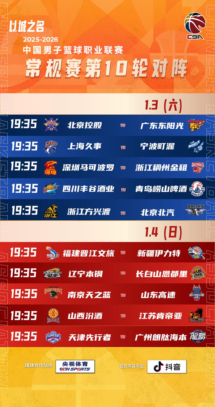 #CBA[超话]# 2025-2026赛季CBA联赛第十轮今日展开争夺 比赛。。第十轮比赛将分为2个比赛日进行,浙江方兴渡主场面对北京北汽、南京天之蓝主场迎来山东高速,看点十足 cba联赛。。你最期待哪场比赛呢。#CBA新年大战# #和CBA一起过新年# #以城之名#