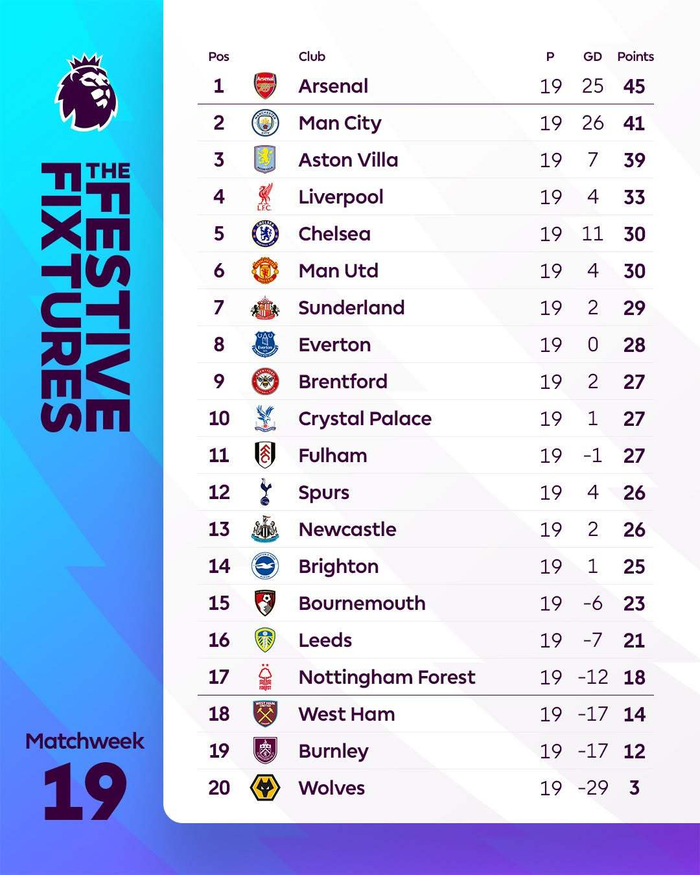【英超积分榜】 #英超# 2025-26赛季英超联赛第19轮积分榜